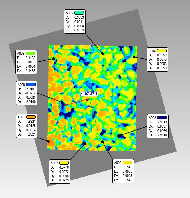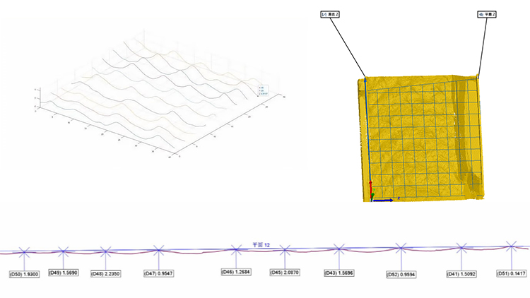 ◎掃描輸出的三維模型直接導(dǎo)入到Geomagic Control檢測(cè)軟件中進(jìn)行分析,圖中是以一個(gè)水平面為參考,計(jì)算出的最大上偏差及最大下偏差,可以由此分析路面的形貌高差。