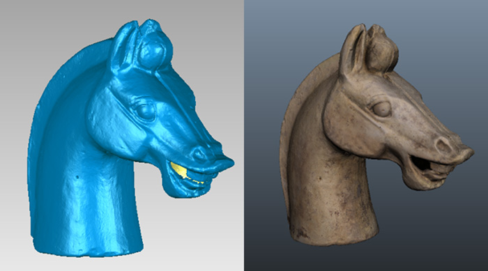 2、后期對(duì)文物外觀拍照,通過ArtMapping軟件將點(diǎn)云與影像自動(dòng)配準(zhǔn)融合,可以迅速得到單體文物帶紋理模型,即可還原文物的真實(shí)外觀。